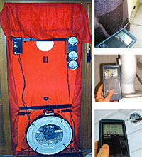 Das Messverfahren: Die Blower-Door-Messung ist ein standardisiertes Verfahren, um die Luftdichtheit eines Hauses quantitativ zu erfassen. Fenster und Türen werden geschlossen. In die Öffnung einer Außentür wird (luftdicht) eine Folie mit Ventilator installiert. Damit wird ein Unterdruck im Innern des Gebäudes erzeugt. Dann wird die Luftmenge definiert, die bei verschiedenen Druckdifferenzen zwischen Innen und Außen durch eventuell vorhandene Leckagen der Gebäudehülle strömt. Sie ist das Maß für die Luftdurchlässigkeit des Gebäudes. Ist die Druckdifferenz aufgebaut, können Leckstellen in der Gebäudehülle gefunden werden. Schon mit der Hand lassen sich die Leckstellen (Zugluft) lokalisieren. Weitere Hilfsmittel: Rauchspender, Luftgeschwindigkeitsmesser, Thermografie.     |