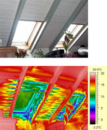 Verfahren: Die Außentemperatur sollte wesentlich niedriger sein als die Raumtemperatur, damit ein entsprechender Wärmestrom von innen nach außen gewährleistet ist und somit möglichst große Temperaturunterschiede entstehen. Das Gebäude sollte Tage vorher schon beheizt werden, so dass insbesondere die Wände gleichmäßig erwärmt sind. Die mittels einer elektronischen Infrarotkamera aufgenommenen sogenannten Thermogramme werden für eine umfangreiche Dokumentation mit spezieller Computersoftware bearbeitet und quantitativ ausgewertet. Bild rechts: Die Thermogramme visualisieren die Oberflächentemperaturen und deren Verteilung an Gebäudekomponenten.    |